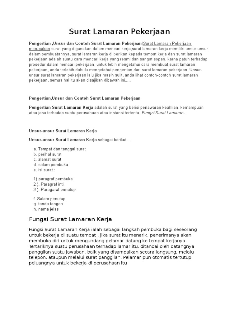 Mengidentifikasi unsur kebahasaan surat lamaran pekerjaan pada dasarnya, surat lamaran pekerjaan dibedakan dari berbagai sumber yang diper. Berikut ini isi, unsur kebahasaan surat lamaran pekerjaan dikategorikan sebagai surat pribadi namun bersifat setengah resmi. Surat lamaran pekerjaan merupakan surat yang ditulis seseorang yang ditujukan kepada lembaga/instansi dengan tujuan mendapatkan pekerjaan. Kembangkan seluruh bagian yang telah ditulis sebelumnya, kembangkan kalimat pokok menjadi alinea atau paragraf penuh. Unsur dalam surat lamaran kerja.